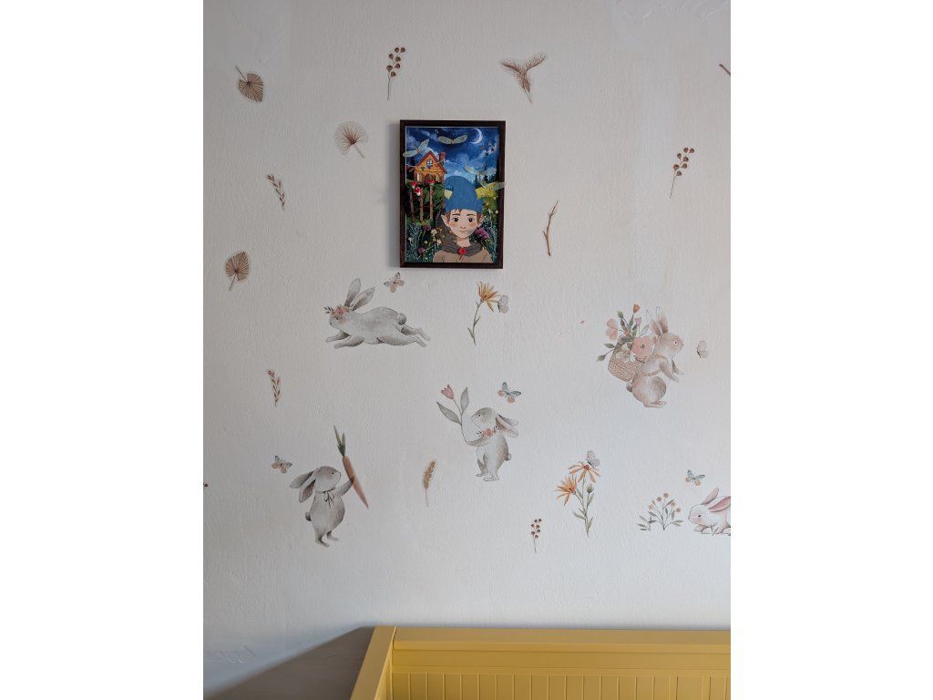 Hotový obrázek s kouzelným lesním skřítkem pro rodiče malých dětí, které si zatím samy nevytvoří koláž z kreativního boxu. Stačí jen rozbalit a užít si společný moment — povídat si o příběhu skřítka, dekorovat dětský pokojíček a tvořit atmosféru, která podporuje fantazii i klidné společné chvilky.
